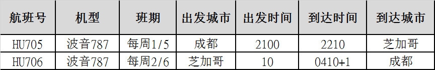 北京时间9月16日21:00,海南航空HU705航班从成都双流国际机场起飞,标志着海南航空成都至芝加哥直飞航线成功首航。该航线采用波音787梦想客机执飞,每周2个往返航班。